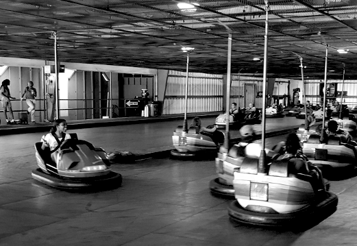 The jam would usually be freed up with the help of the attendant who put his life (or at least his legs) in jeopardy, dodging his way around the speeding cars. (Although the video game Frogger wasn’t invented till decades later, watching him was like watching a live game of Frogger.) At the pileup, he’d pull, tug and yank on the stuck cars (which had no reverse capability) and get them disentangled. Then they’d be off to the races again, with the attendant left in their dust shouting at the recalcitrant drivers to follow the rules and “YOU CAN ONLY GO CLOCKWISE.” He didn’t seem to grasp the whole concept of bumper cars: a time to break the rules, and cause chaos and mayhem until our ride was over, even if it meant not going clockwise.